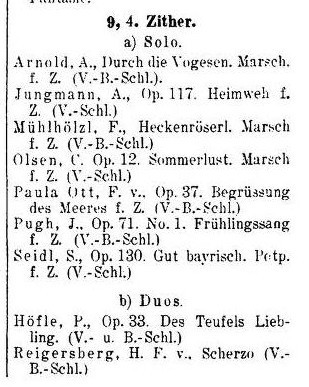 Mandolinenquartett: Ascher, J., Op. 40. Fanfare militaire Jensen, A., Op. 17. No. 3. Die Mühle. Lehár, F., Wiener Mädel. Marsch. Leopoldi, H., Op. 40. Schön sind die Mädels von Prag. Liszt, F. Pussta-Wehmut. Mozart, W. A., Sinfonie Esdur. Offenbach, J., Die schöne Helena. Quadrille. Rameau, J. P., Gavotte und Werke von Bernards, Buchbinder, Clewing, Erwin, Goldschmidt, Goltermann, Hollaender, Loeser, Oscheit, Pfeil, Plessow, Pressel, Profes, Radeck, Rebner, Schütz |