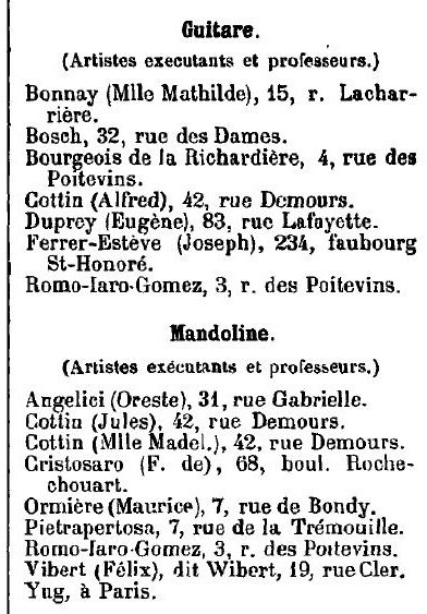 Jules CottinAuf dieser Seite habe ich eineige Quellen aus der Biblitheque Nationale de France zusammengestellt. Es ist interessant zu sehen wie die Zahl der Mandolinenlehrer zwischen 1893 und 1906 rasant angestiegen ist. Die genauen Quellenangaben werde ich nich ergänzen. Jules und Alfred Cottin, und auch ihre jüngere Schwester Madeleine Cottin waren sehr erfolgreich als Lehrer und Solisten für Mandoline und Gitarre Quelle: Ausgaben des Annuaire des Artites et de l'Enseignement dramatique et musical in der bnf: *** On this page I have compiled some interesting sources about Jules Cottin. Jules Cottin, Alfred Cottin and their younger sister Madeleie Cottin were very successfull in Paris as teachers and players of mandolin and guitar. It is interesting to see how the number of mandolin teachers has grown from 1893 until 1906. Jules Cottin (1868-1922) was a mandolin virtuoso who played in Paris in the 1890s. Source: Annuaire des Artites et de l'Enseignement dramatique et musical available in the Bibliotheque Nationale de France: |