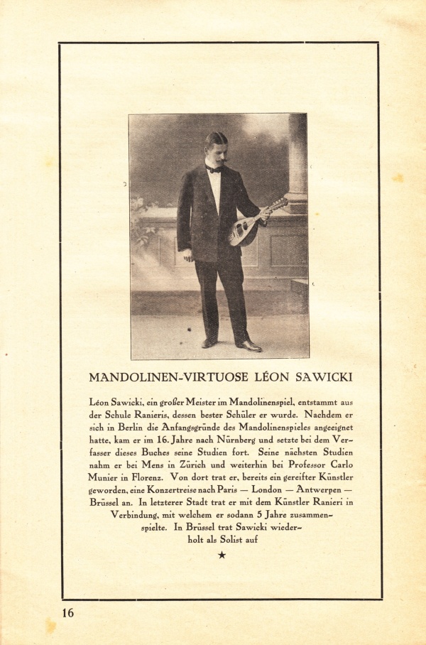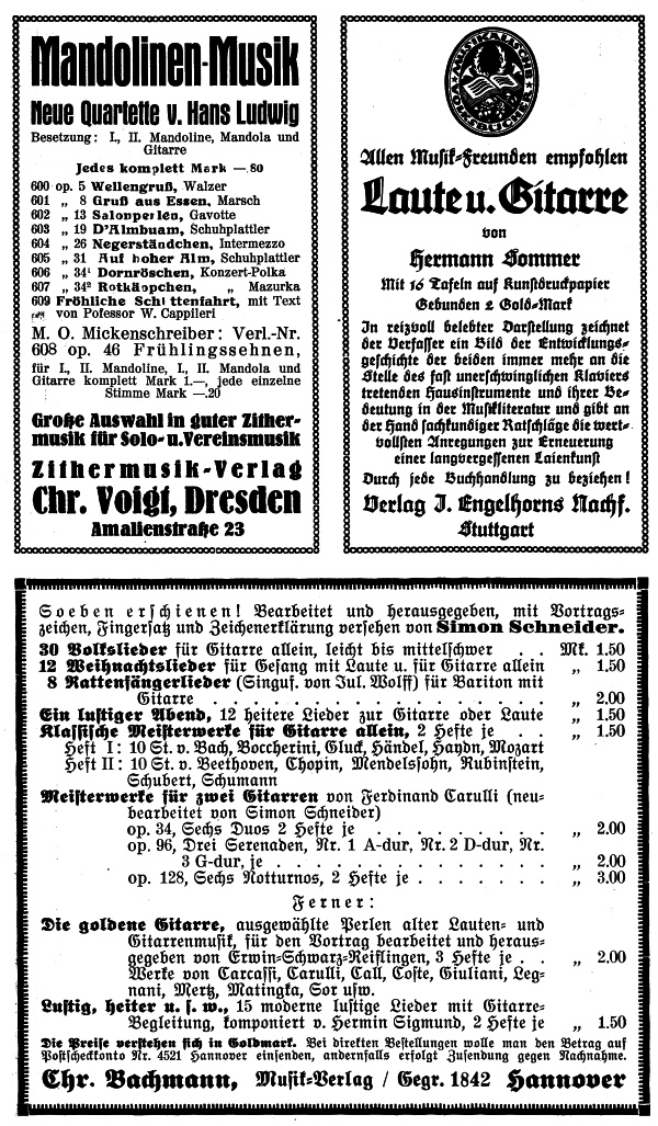 Karl BossDie Mandolinenmusikvor und nach dem Kriege im In- und AuslandeDie Entstehung des Deutschen Mandolinisten- und Gitarristen-BundesKarl Boss - OberpostsekretärII. Vorsitzender im Südgau des D. M. G. B. In dieser Veröffentlichung die ca. 1924 erschienen sein muss berichtet Karl Boss über die Zeit zwischen 1900 und den frühen 1920er Jahren. 1913 wurde der Deutsche Mandolinisten- und Gitarristen Bund (D. M. G. B.) gegründet. Durch den Weltkrieg wurde die weitere Entwicklung allerdings unterbrochen und erst im Laufe der 1920er Jahre etablierte sich diese Organisation weiter. Download des kompletten Dokuments als PDF (ca. 12 MB): karl-boss-mandolinenmusik.pdf |