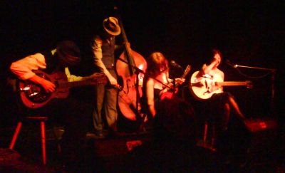 Bliss Blood steht mit ihrer Stimme und der kleinen Ukulele im Vordergrund und führt die Band, Cindi Ball ergänzt dazu wunderbar swingende Harmonien. Peter Maness am Kontrabass und vor allem Mark Deffenbaugh an der 8-saitigen Lap Steel Gitarre sind immer wieder mit tollen Soli zu hören. Das Repertoir setzt sich zusamen aus Swing Titeln aus den 20er und 30er Jahren und Eigenkompositionen im selben Stil Die weiteren Daten der Deutschlandtournee fndet man auf der Myspace Seite der Moonlighters. Dort gibt es auch ein paar Titel aus dem aktuellen Repertoir und aus der neuen - bereits als Limited Edition erhältlichen CD Enchanted. Hier drei Schnappschüsse vom Konzert, die ich mit meinem Handy gemacht habe: